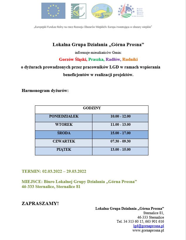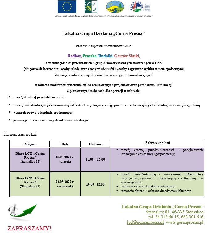 SPOTKANIA INFORMACYJNE NT. PLANOWANYCH NABORÓW WNIOSKÓW REALIZOWANYCH PRZEZ LGD GÓRNA PROSNA