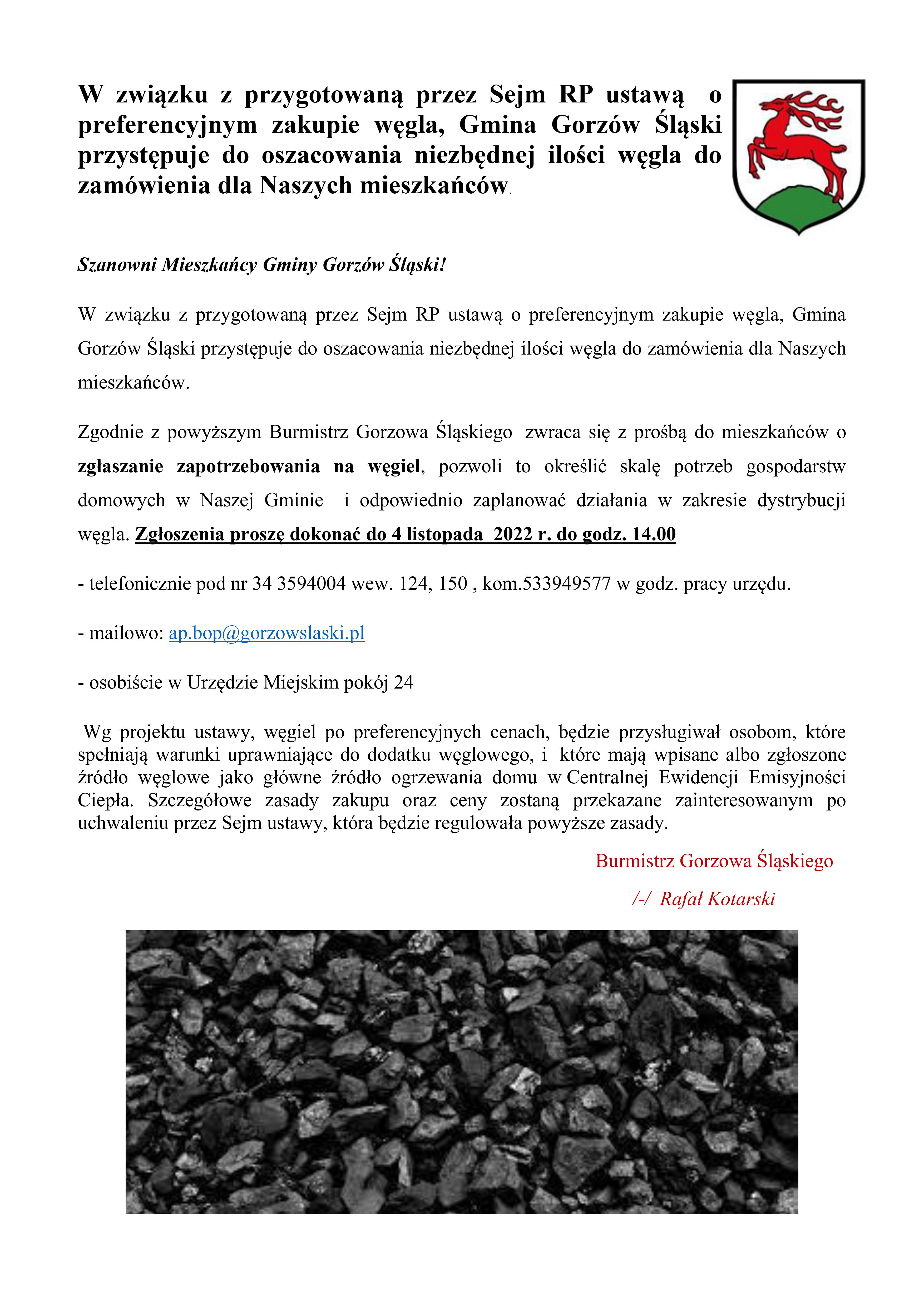 W związku z przygotowaną przez Sejm RP ustawą o preferencyjnym zakupie węgla, Gmina Gorzów Śląski przystępuje do oszacowania niezbędnej ilości węgla do zamówienia dla Naszych mieszkańców