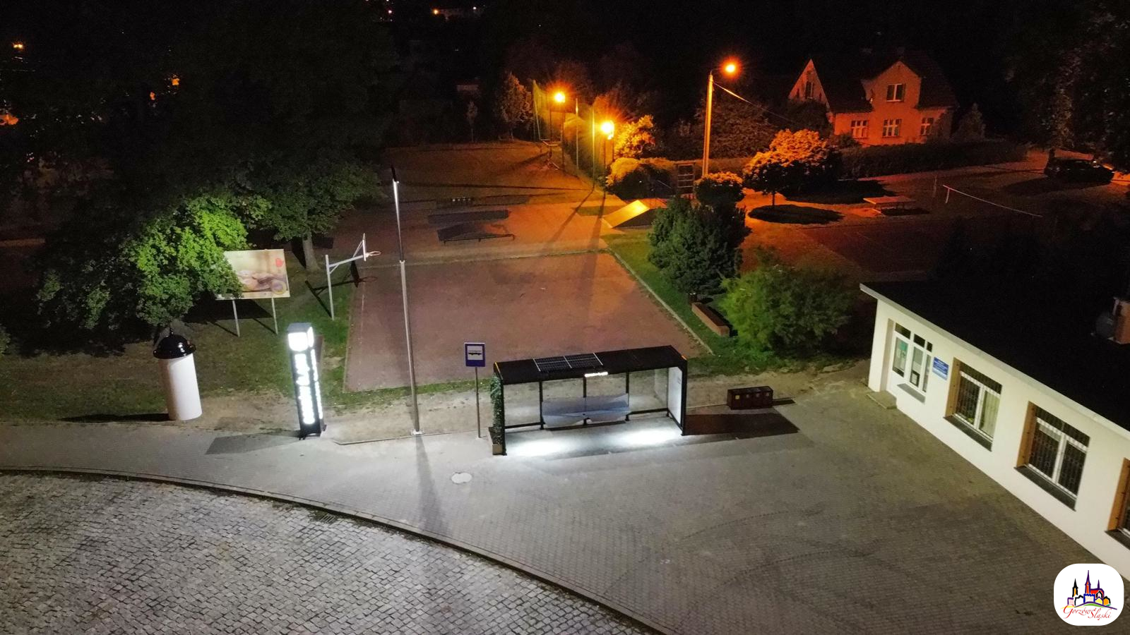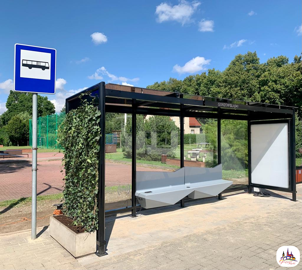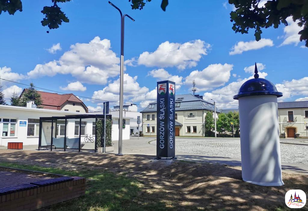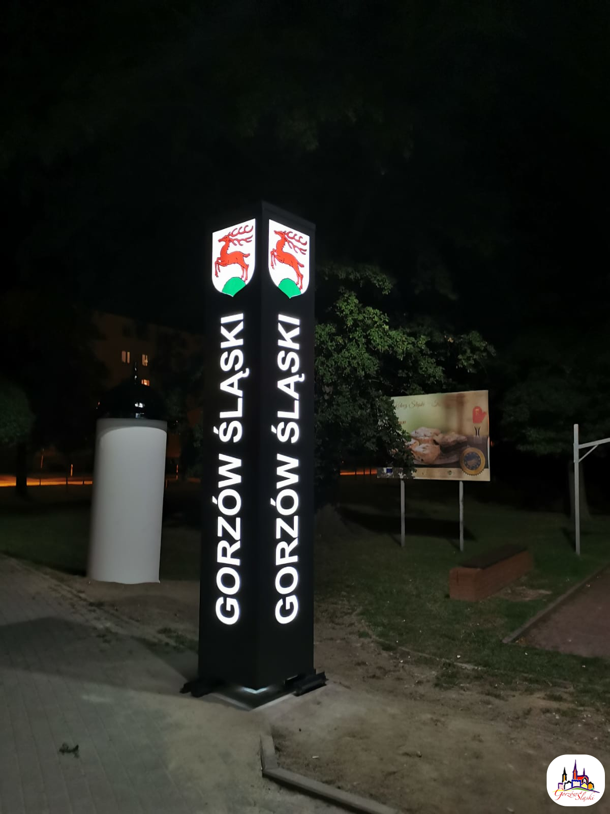 Obok przystanku stanął podświetlany pylon z napisem GORZÓW ŚLĄSKI i herbem . Polecamy zobaczyć go wieczorem, wtedy prezentuje się najpiękniej. Jest też latarnia LED, która w pełni rozświetla to miejsce.